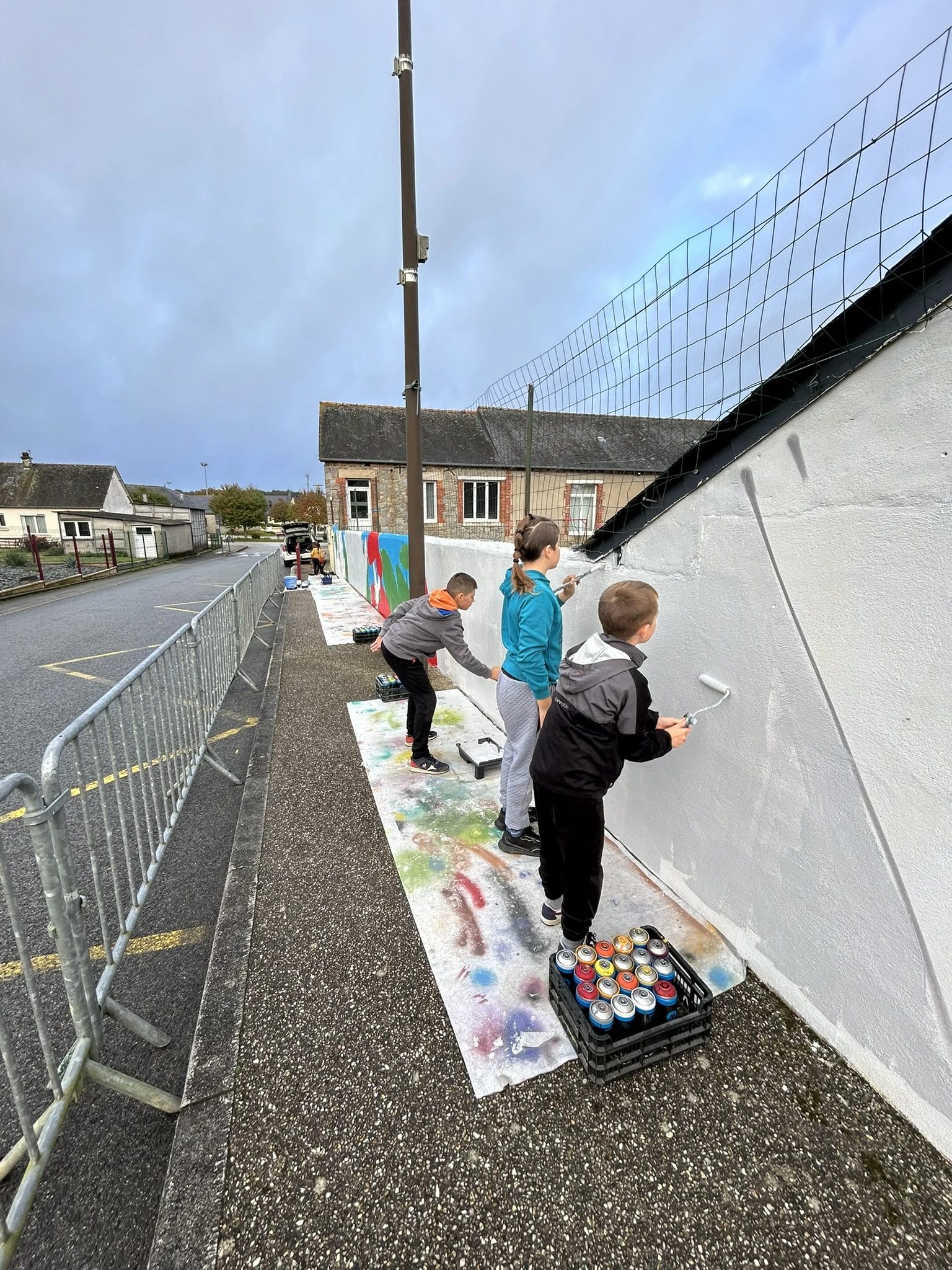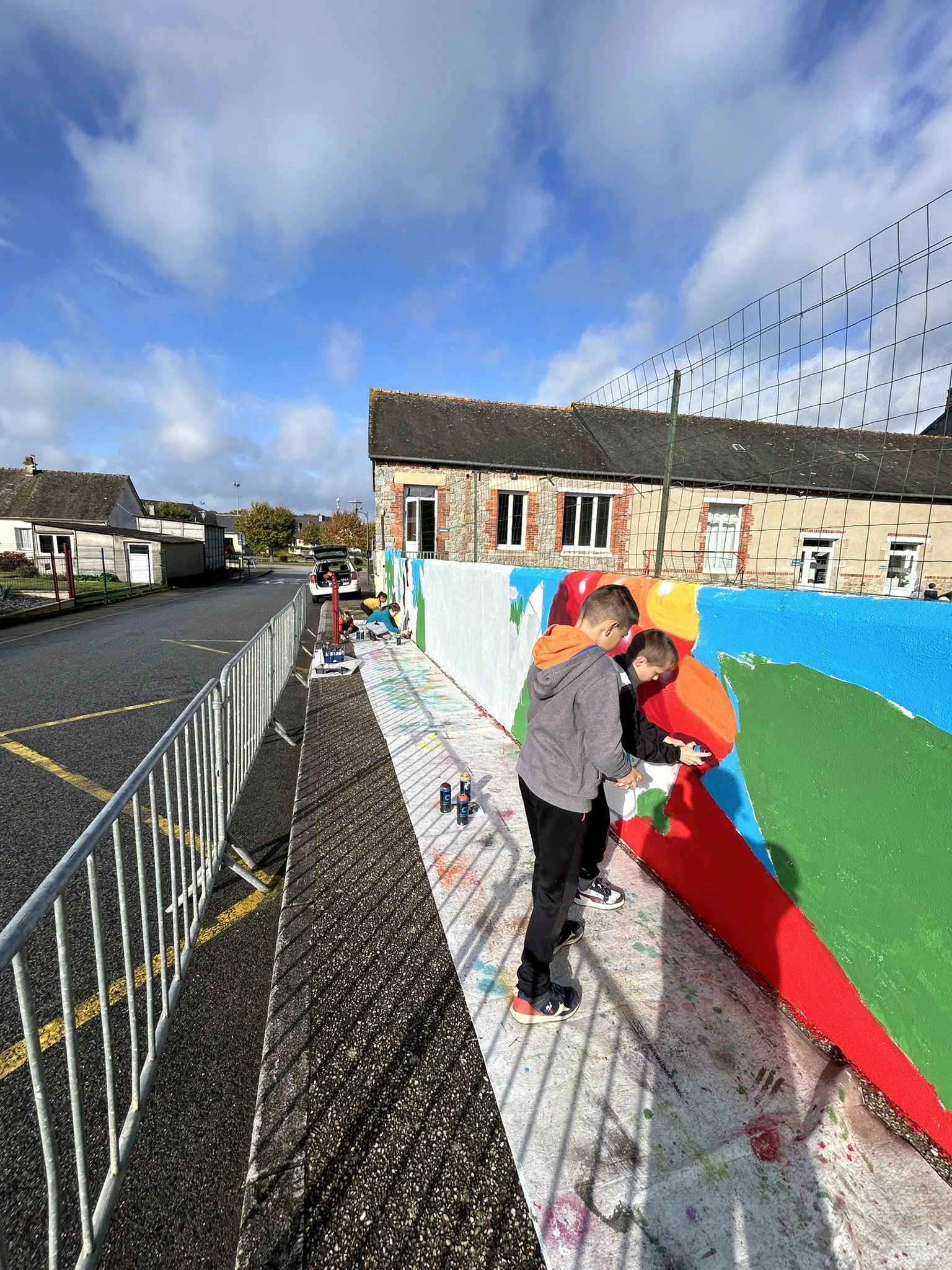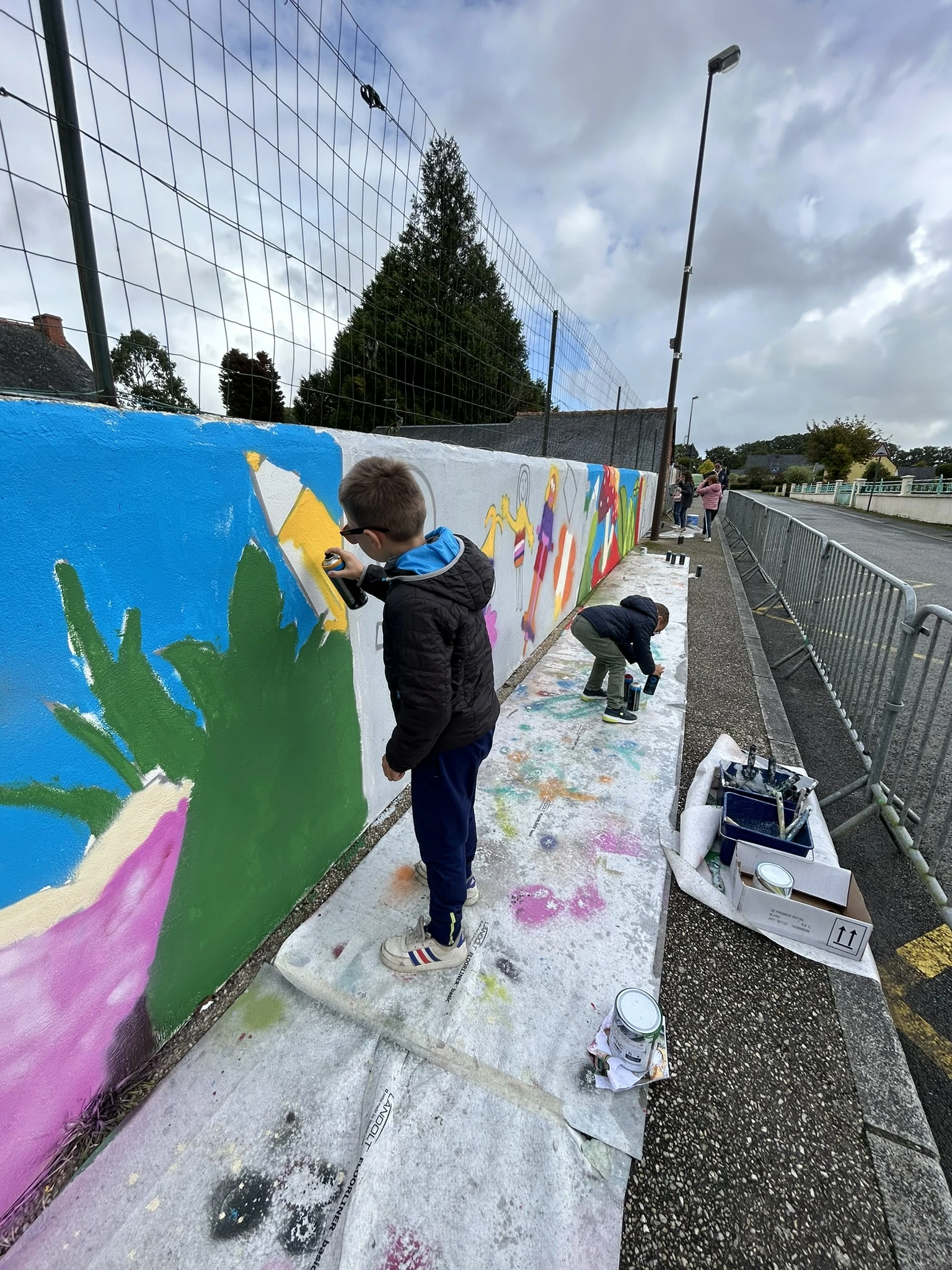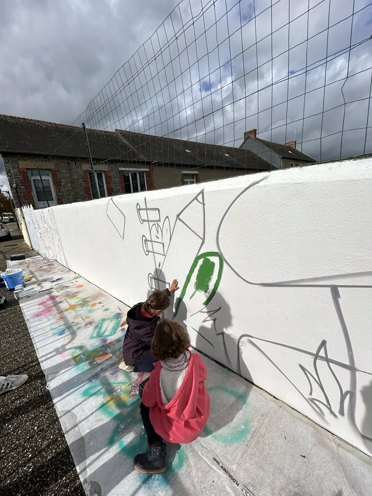 Dessin et pratique de la peinture au rouleau et pinceau, ainsi qu'à la bombe. Impliquant tous les élèves de l'école.