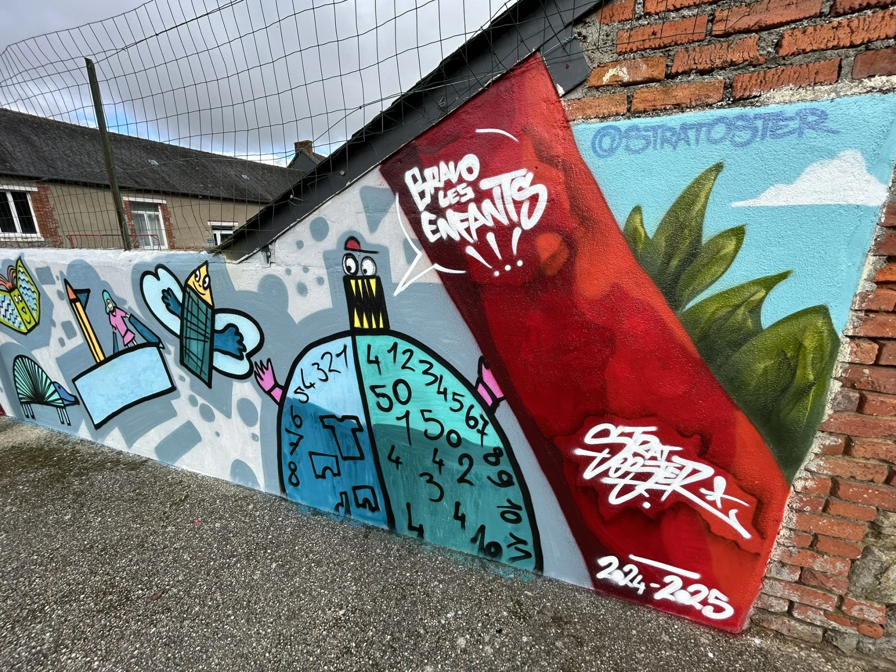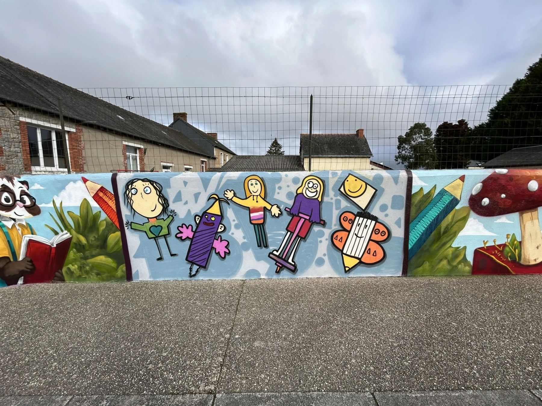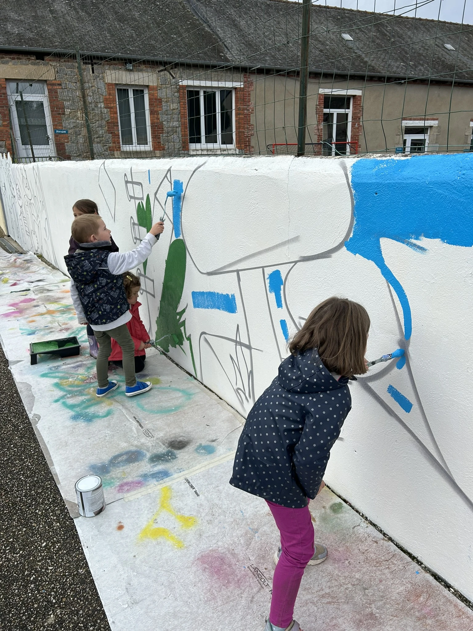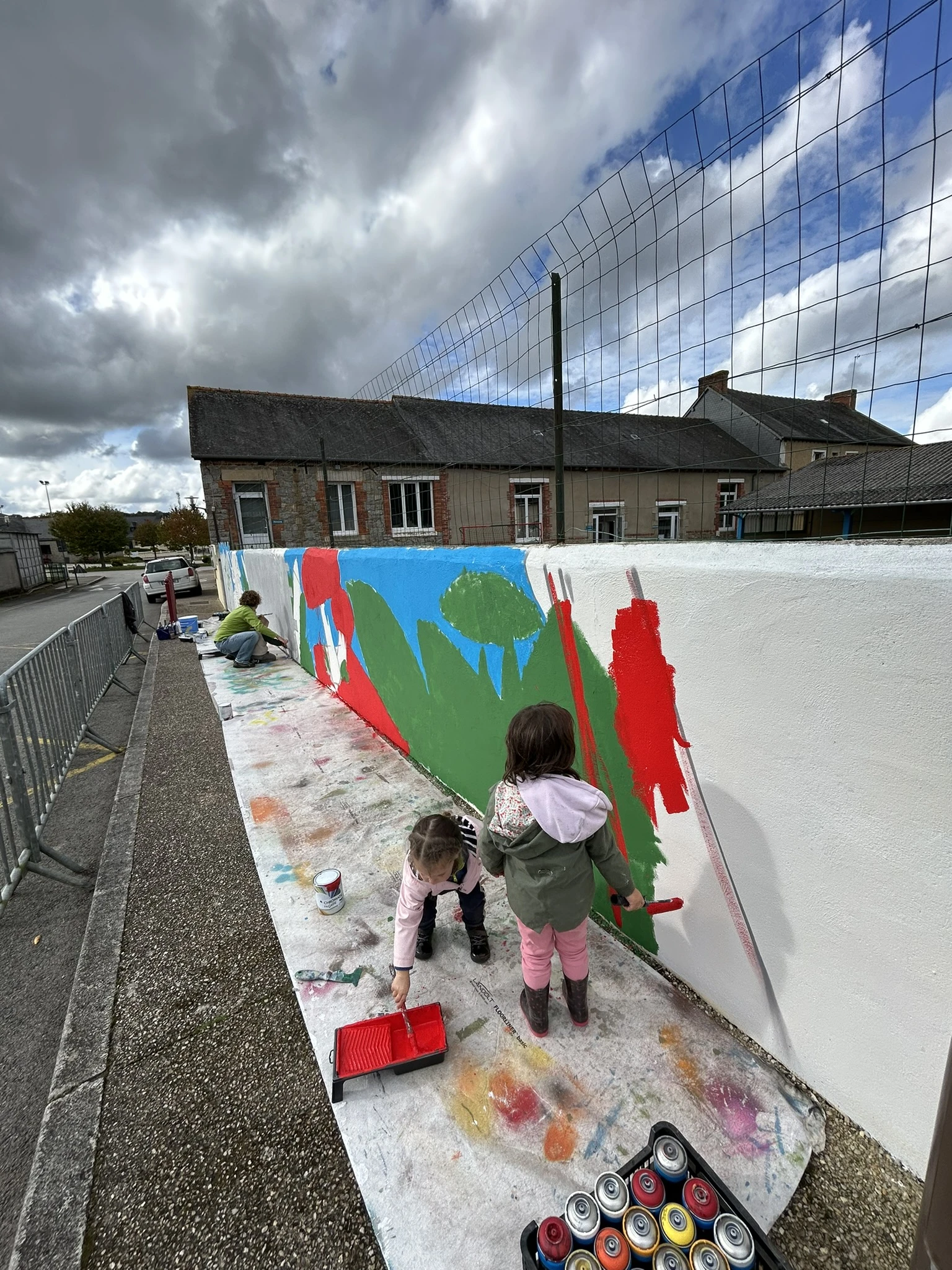 Dessin et pratique de la peinture au rouleau et pinceau, ainsi qu'à la bombe. Impliquant tous les élèves de l'école.