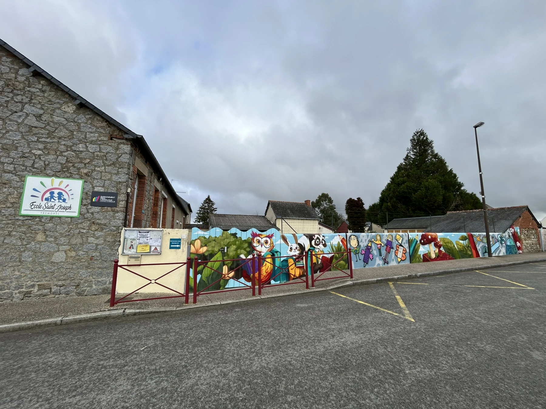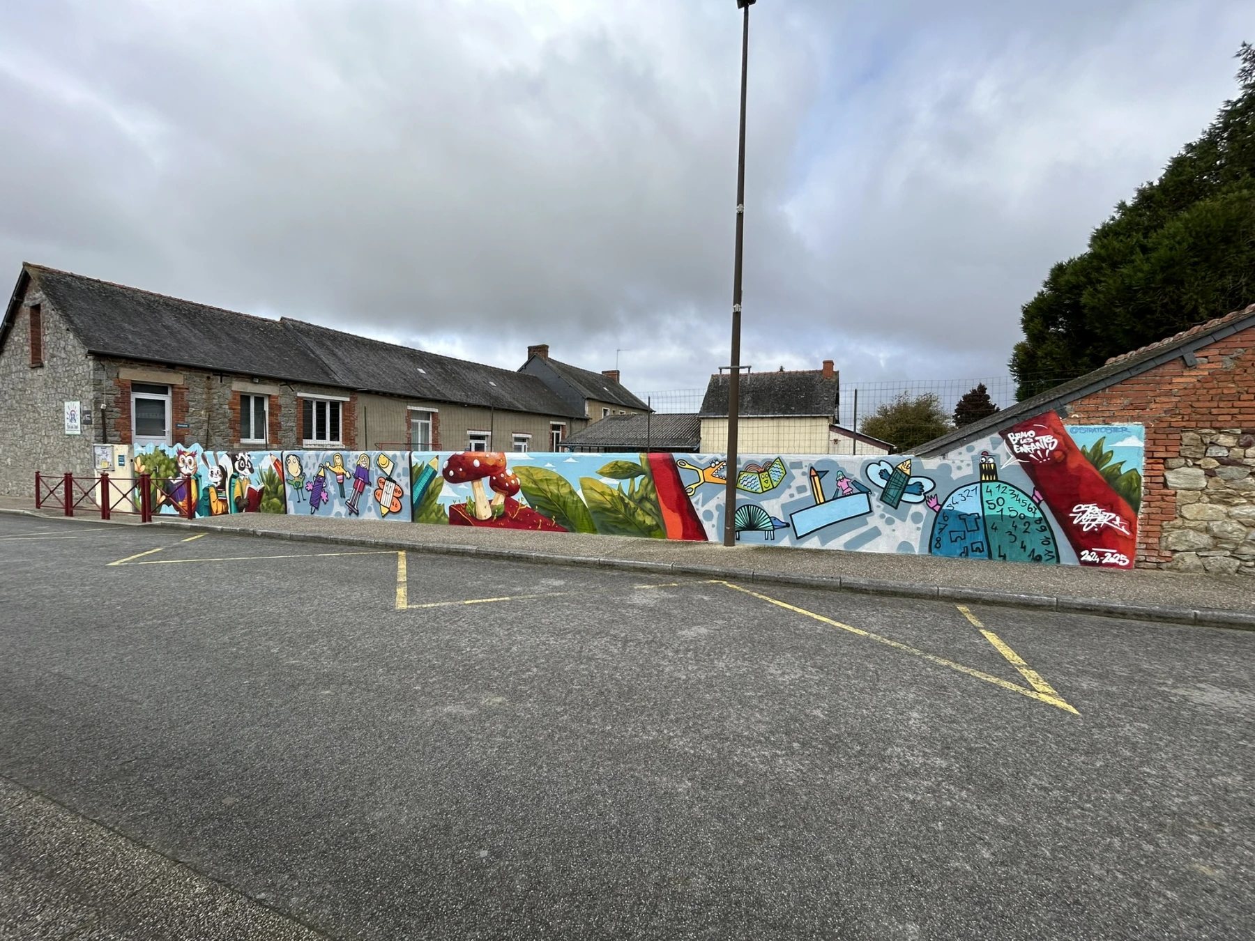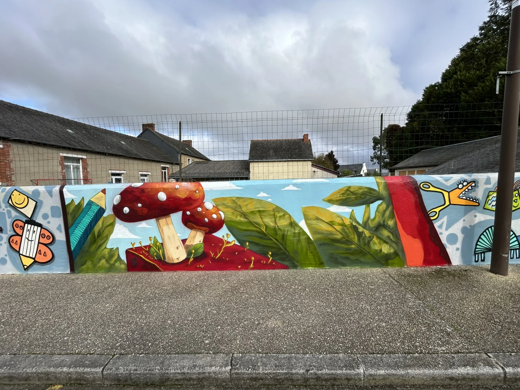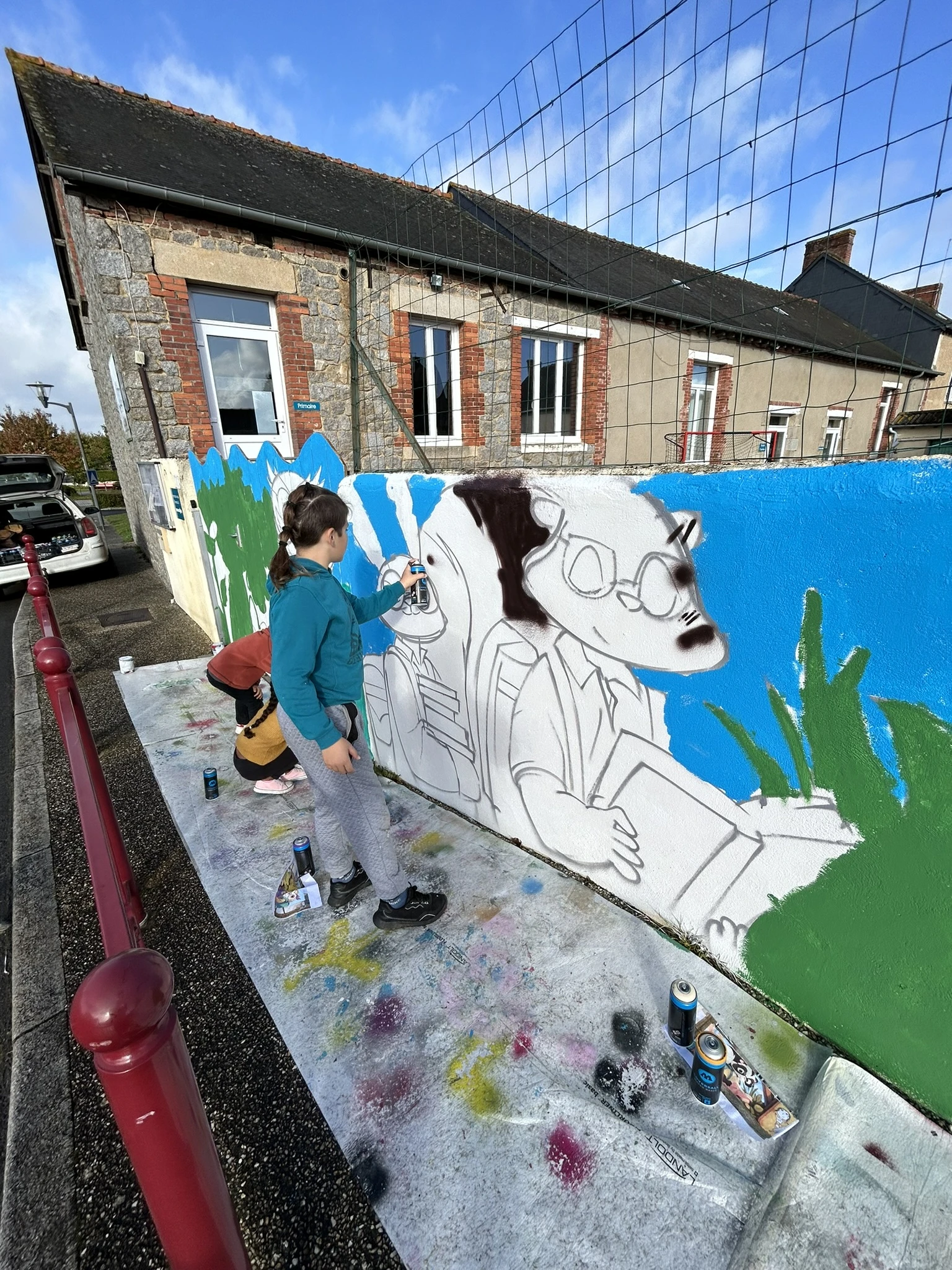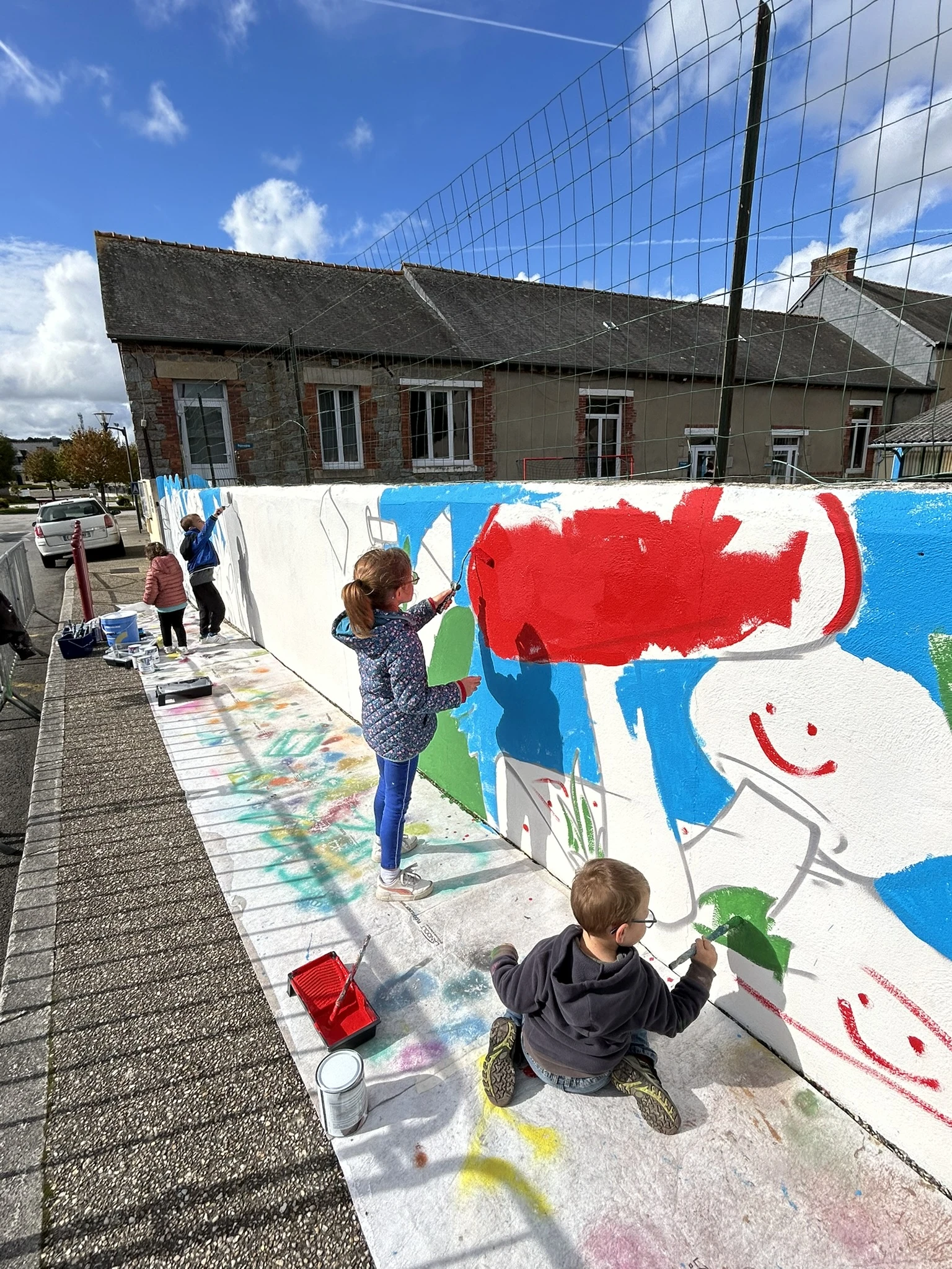 Dessin et pratique de la peinture au rouleau et pinceau, ainsi qu'à la bombe. Impliquant tous les élèves de l'école.