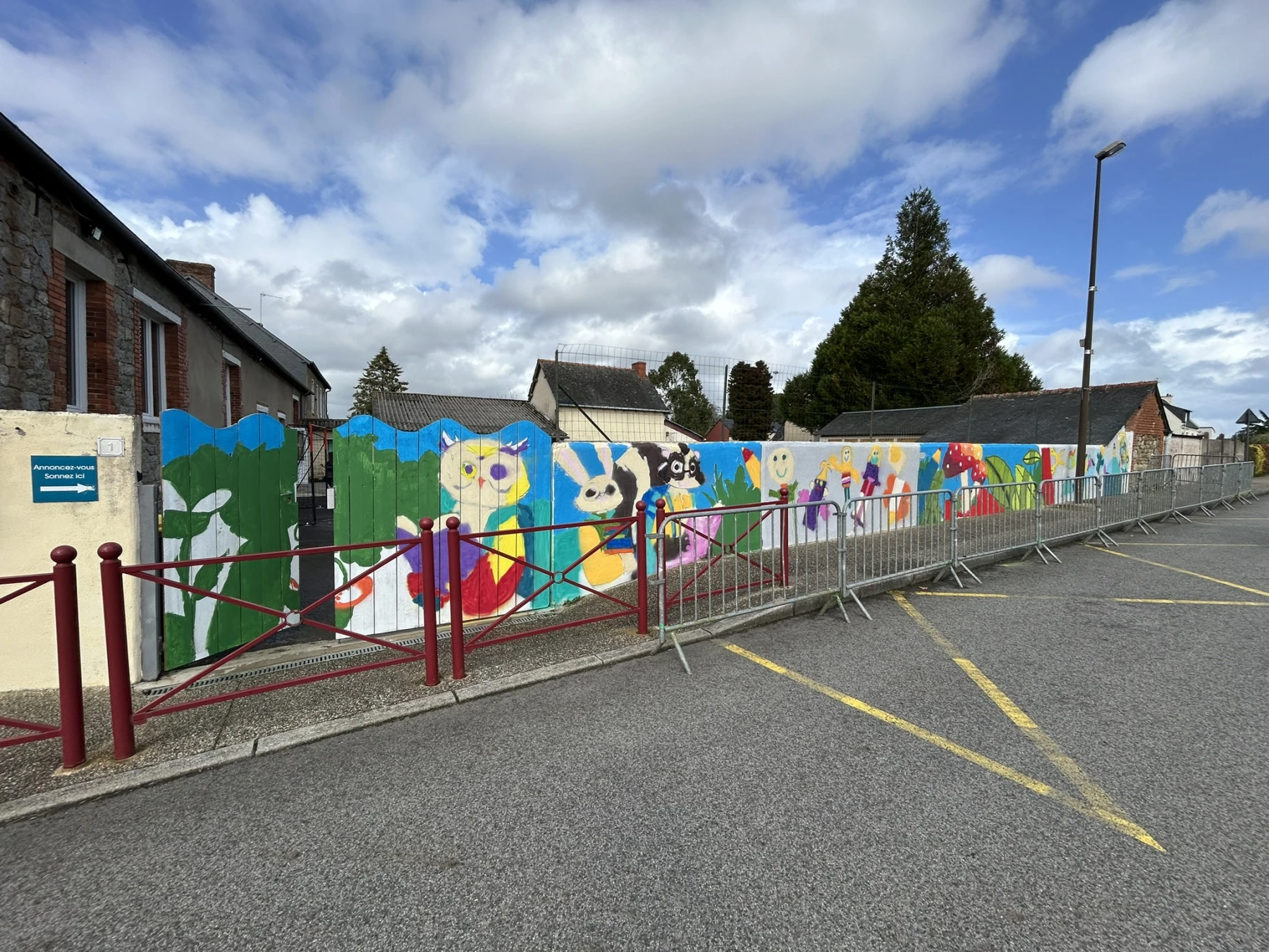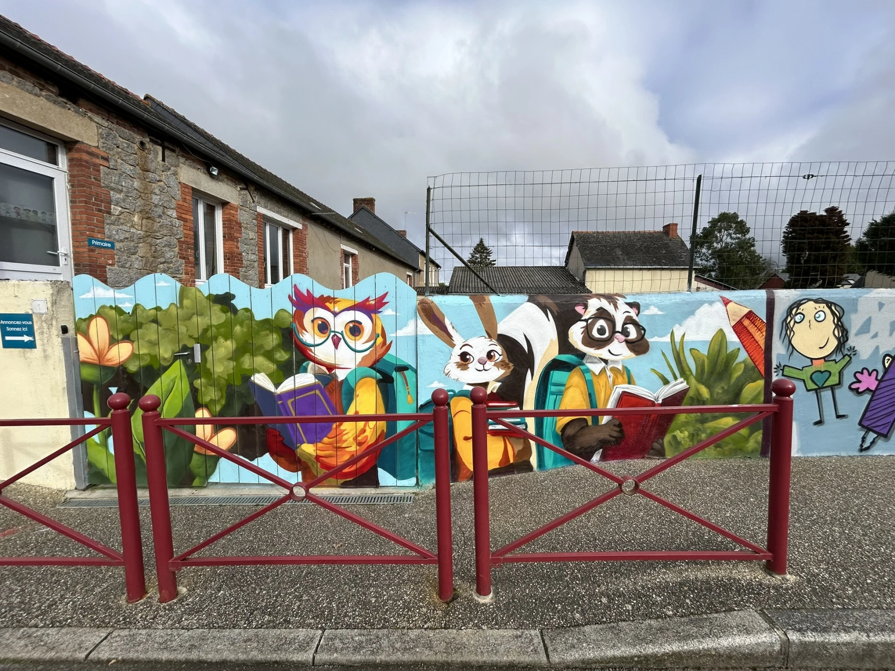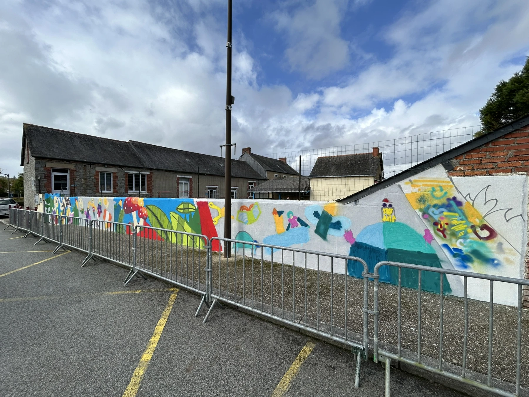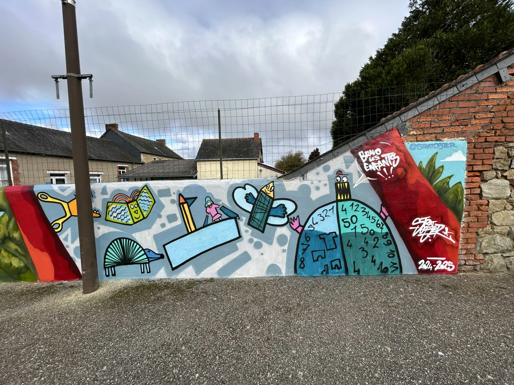 Dessin et pratique de la peinture au rouleau et pinceau, ainsi qu'à la bombe. Impliquant tous les élèves de l'école.