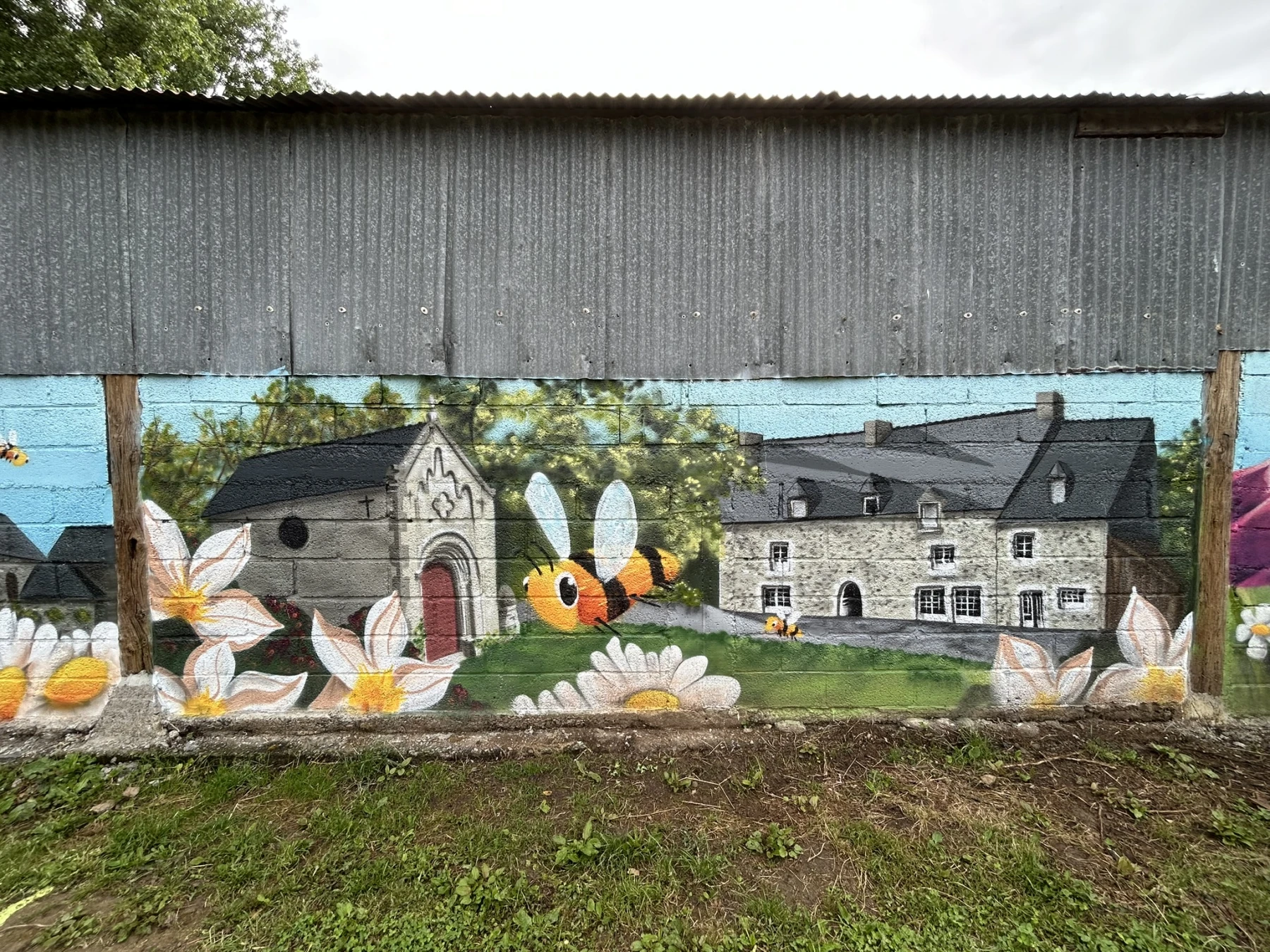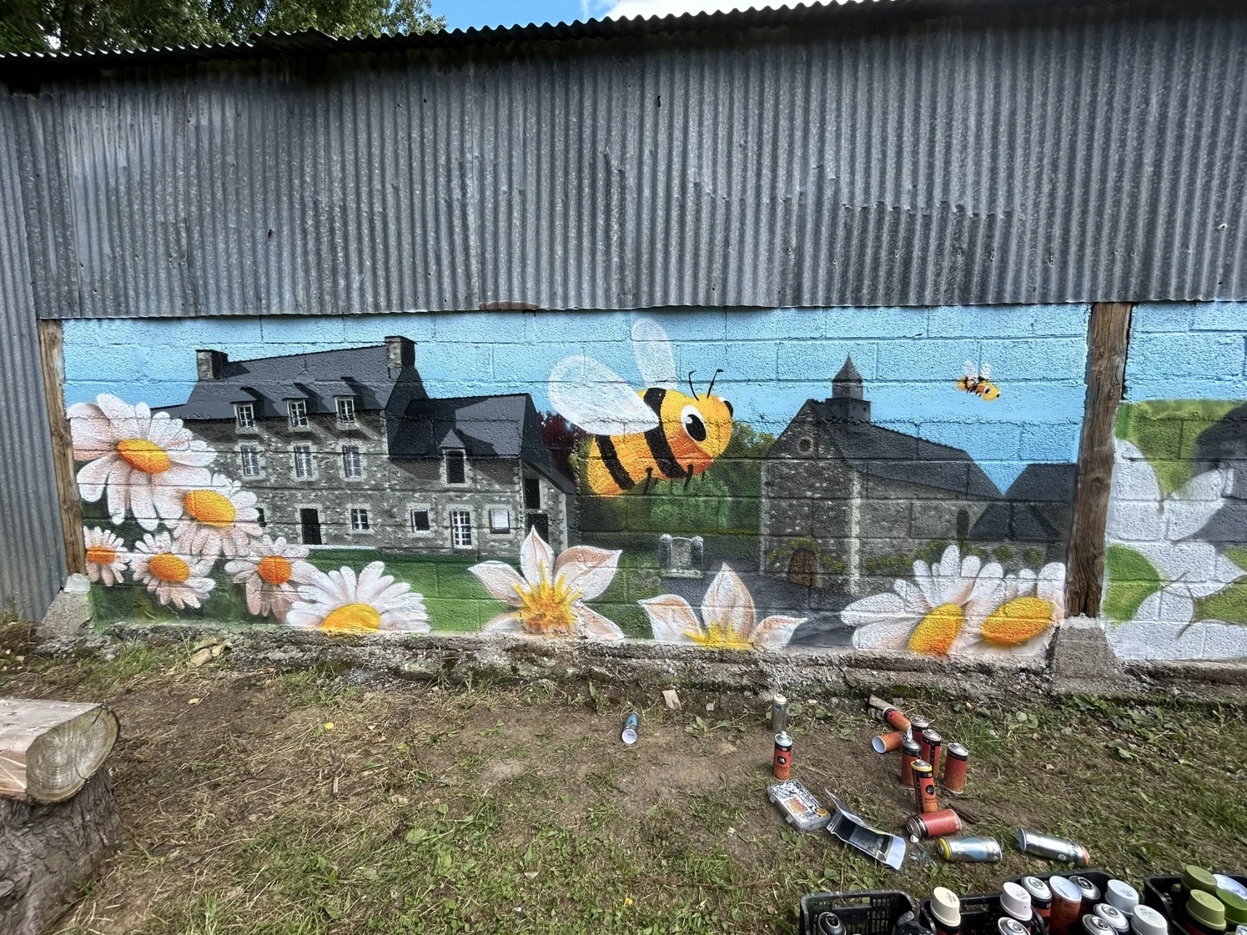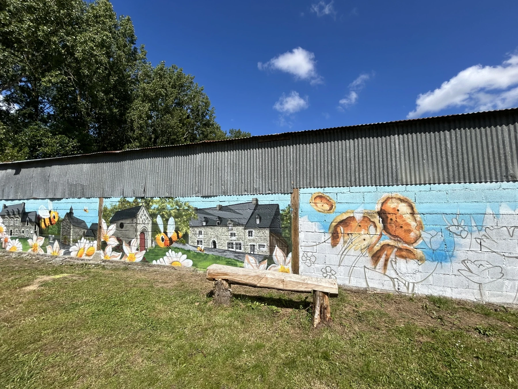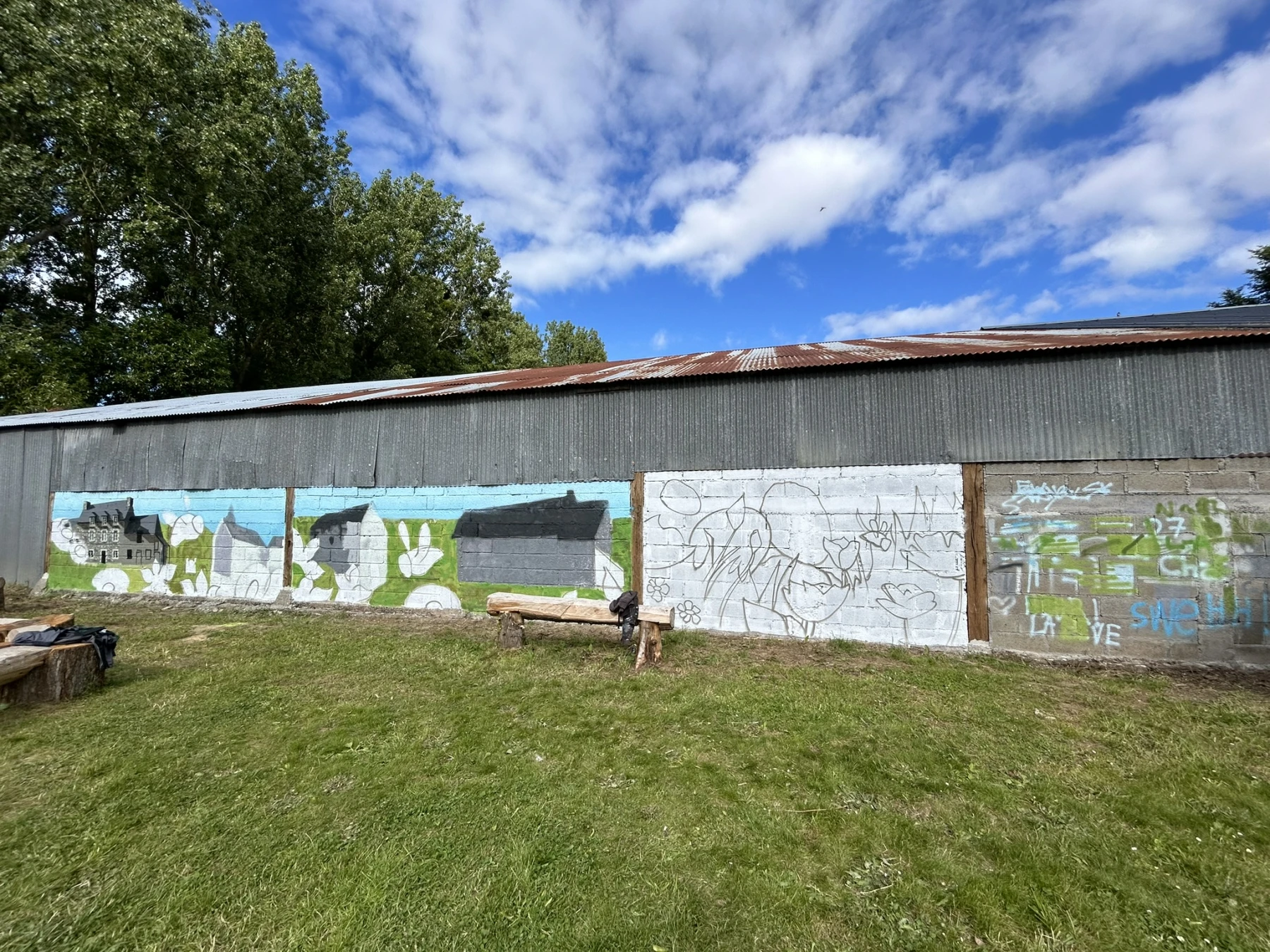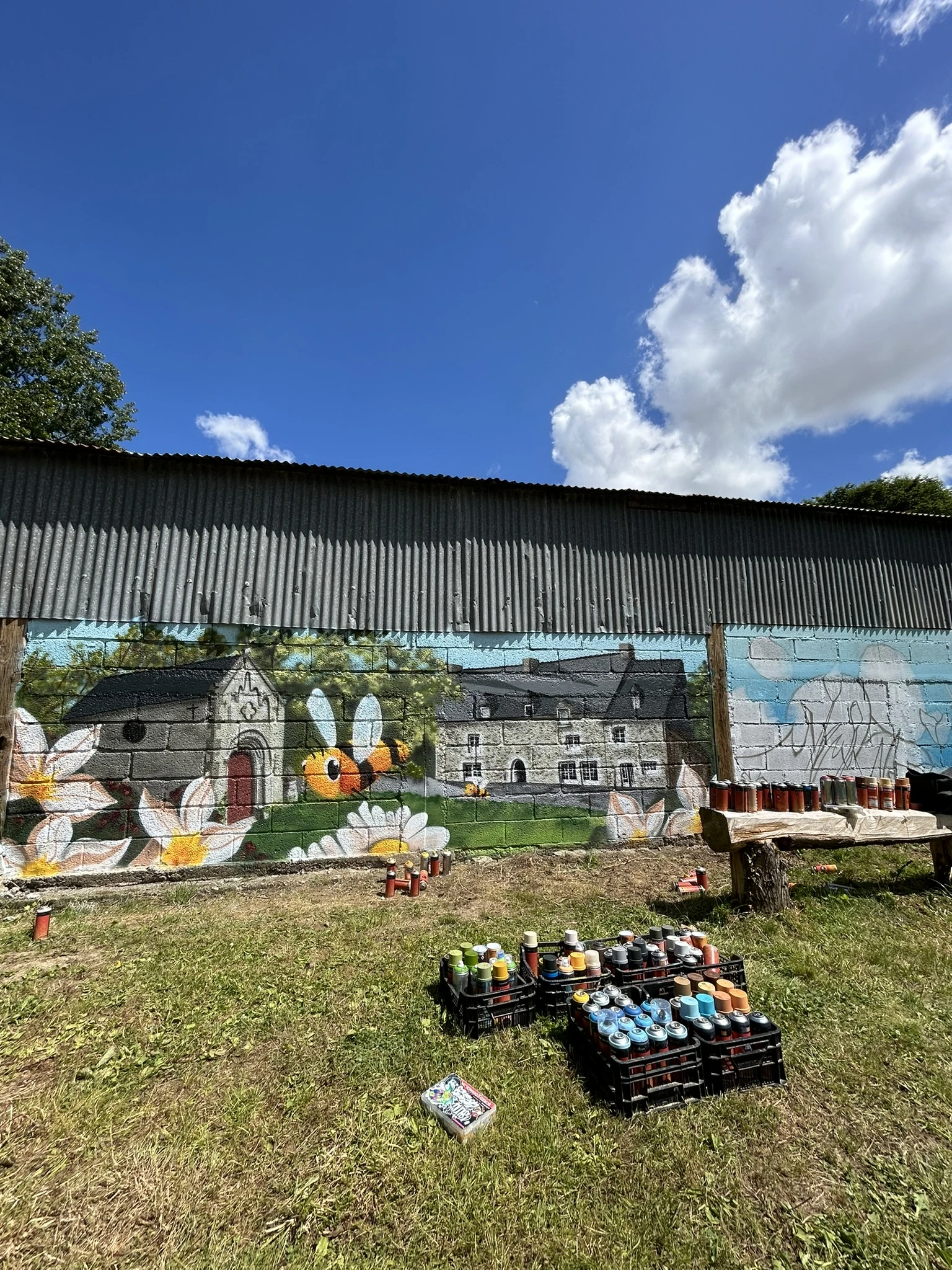 Fresque décorative et participative pour les 90 ans de la commune, regroupant le patrimoine et l'histoire de la commune