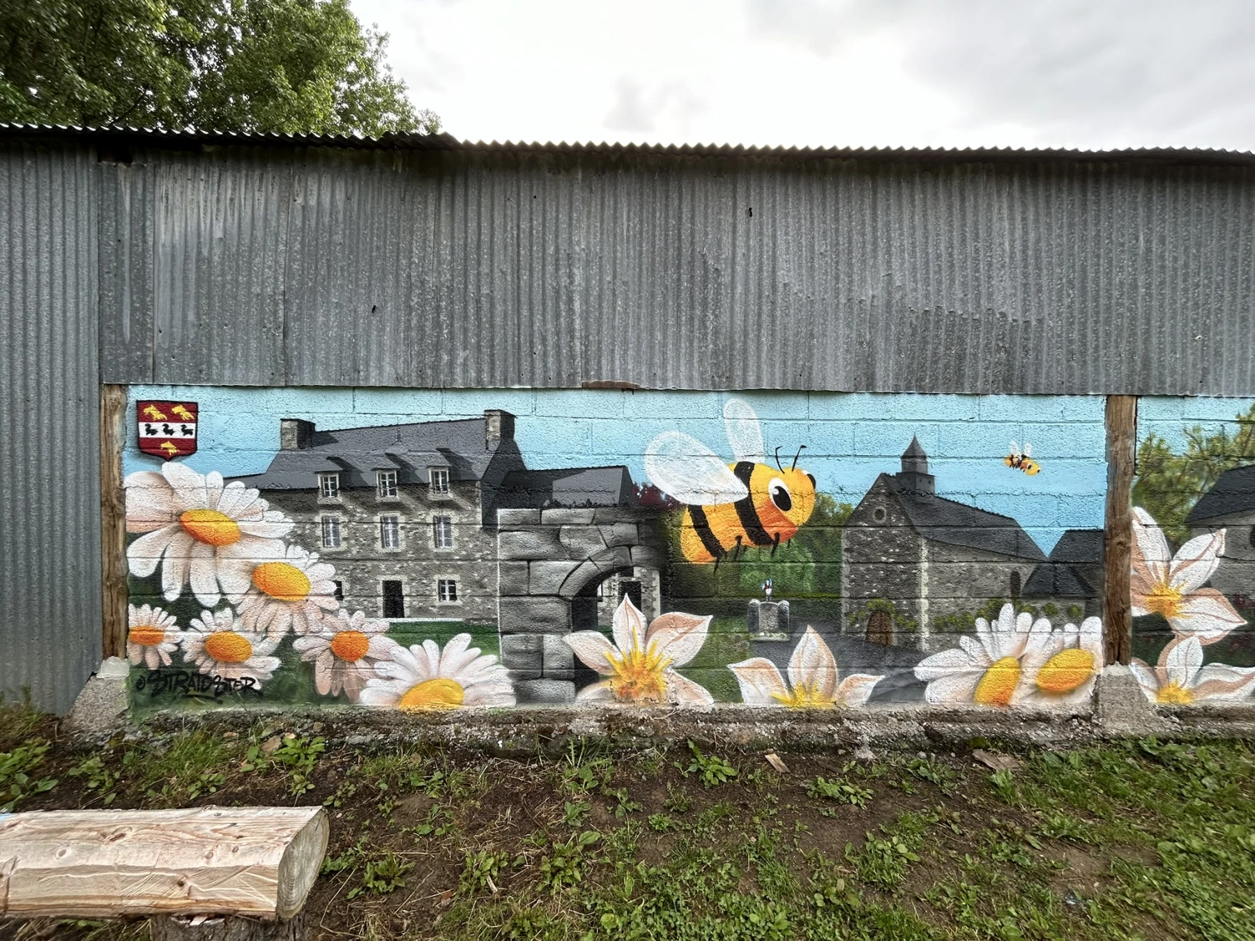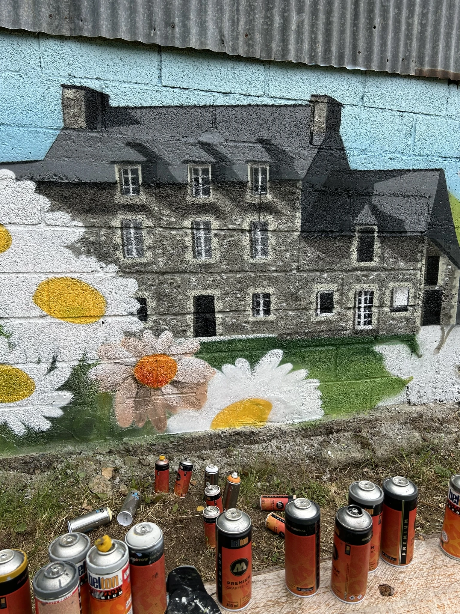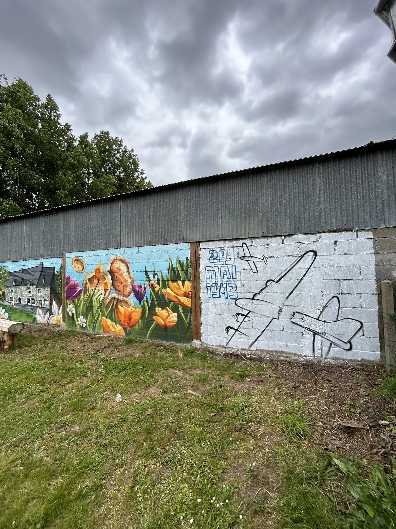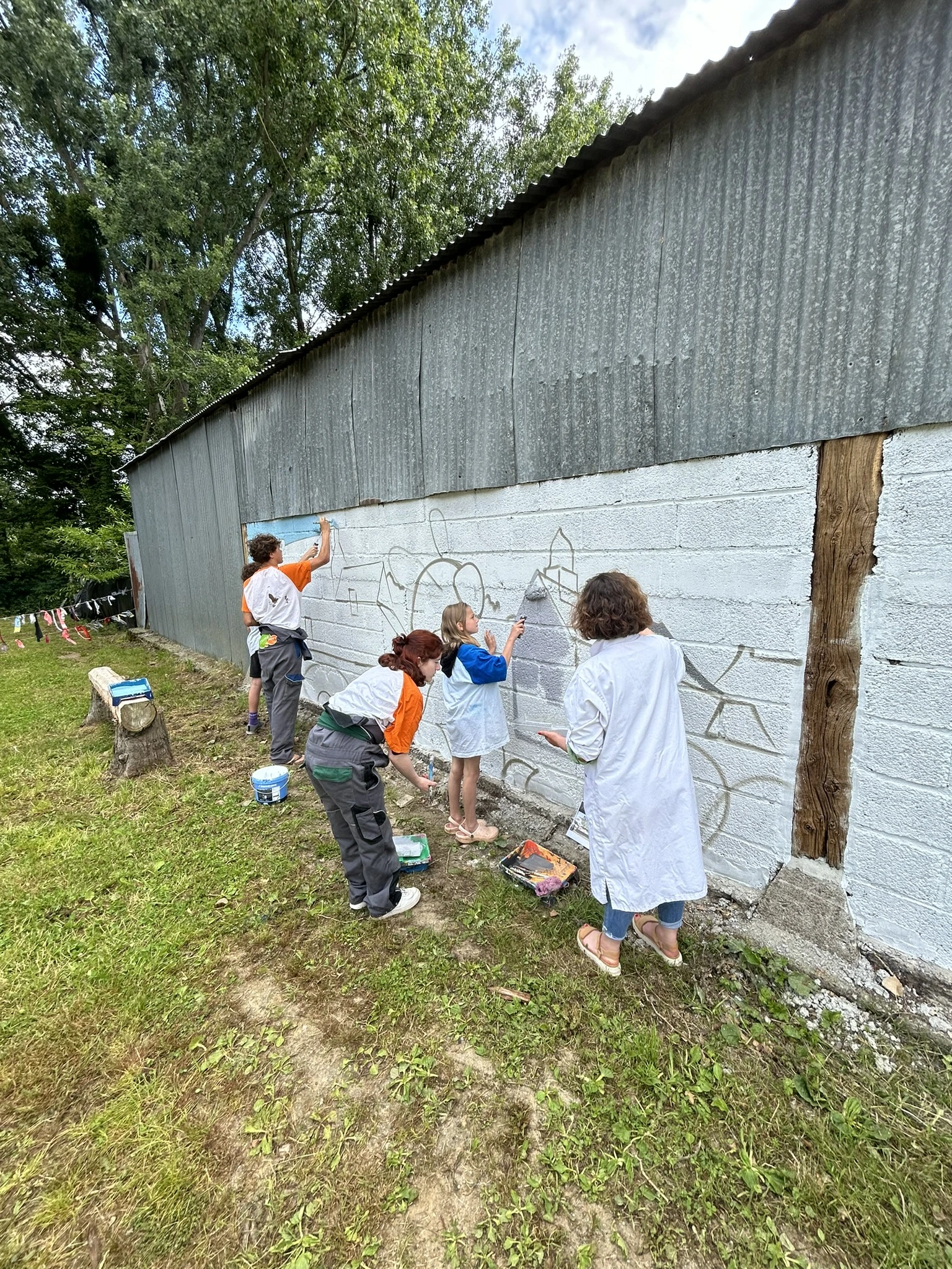 Fresque décorative et participative pour les 90 ans de la commune, regroupant le patrimoine et l'histoire de la commune
