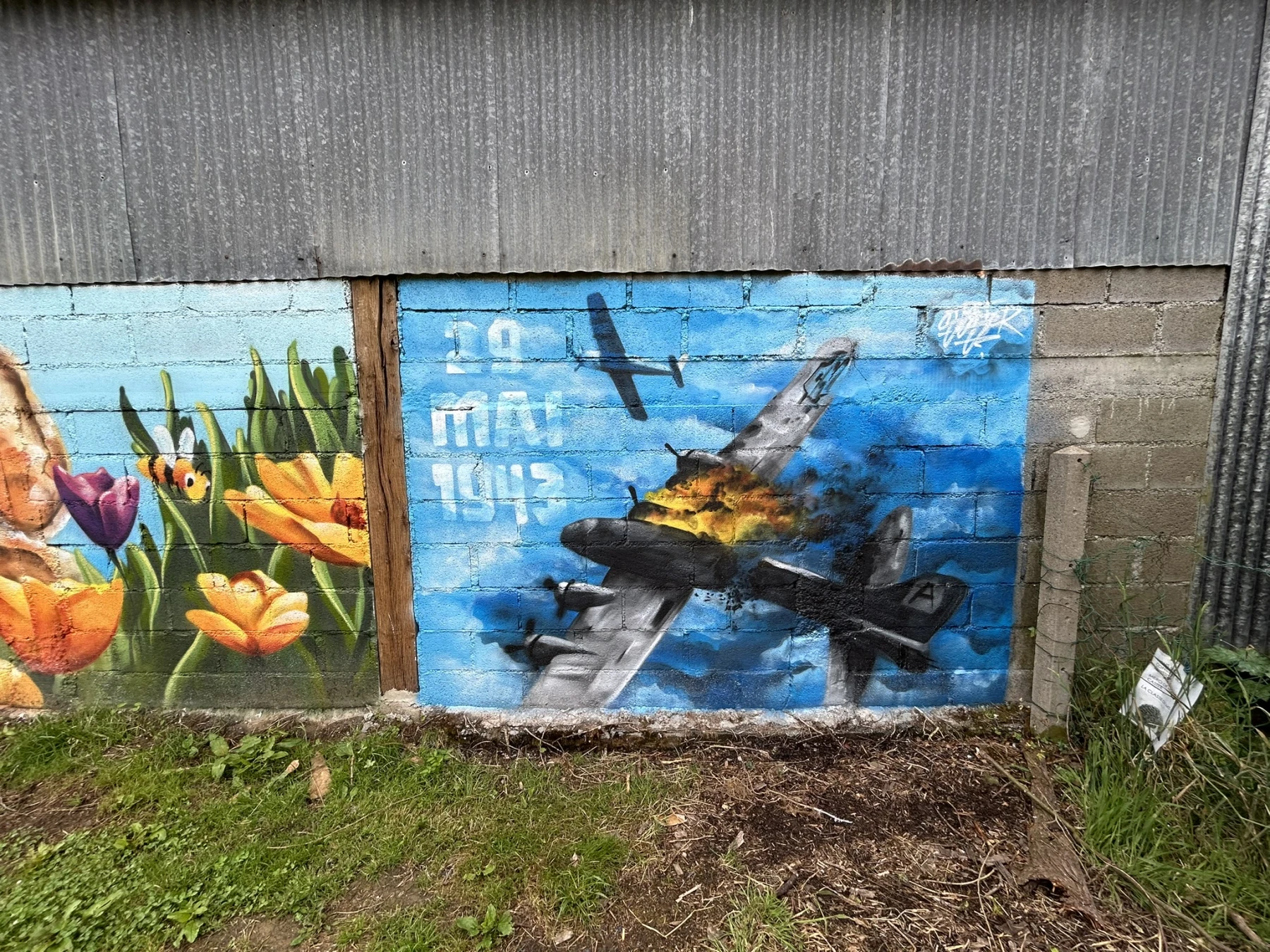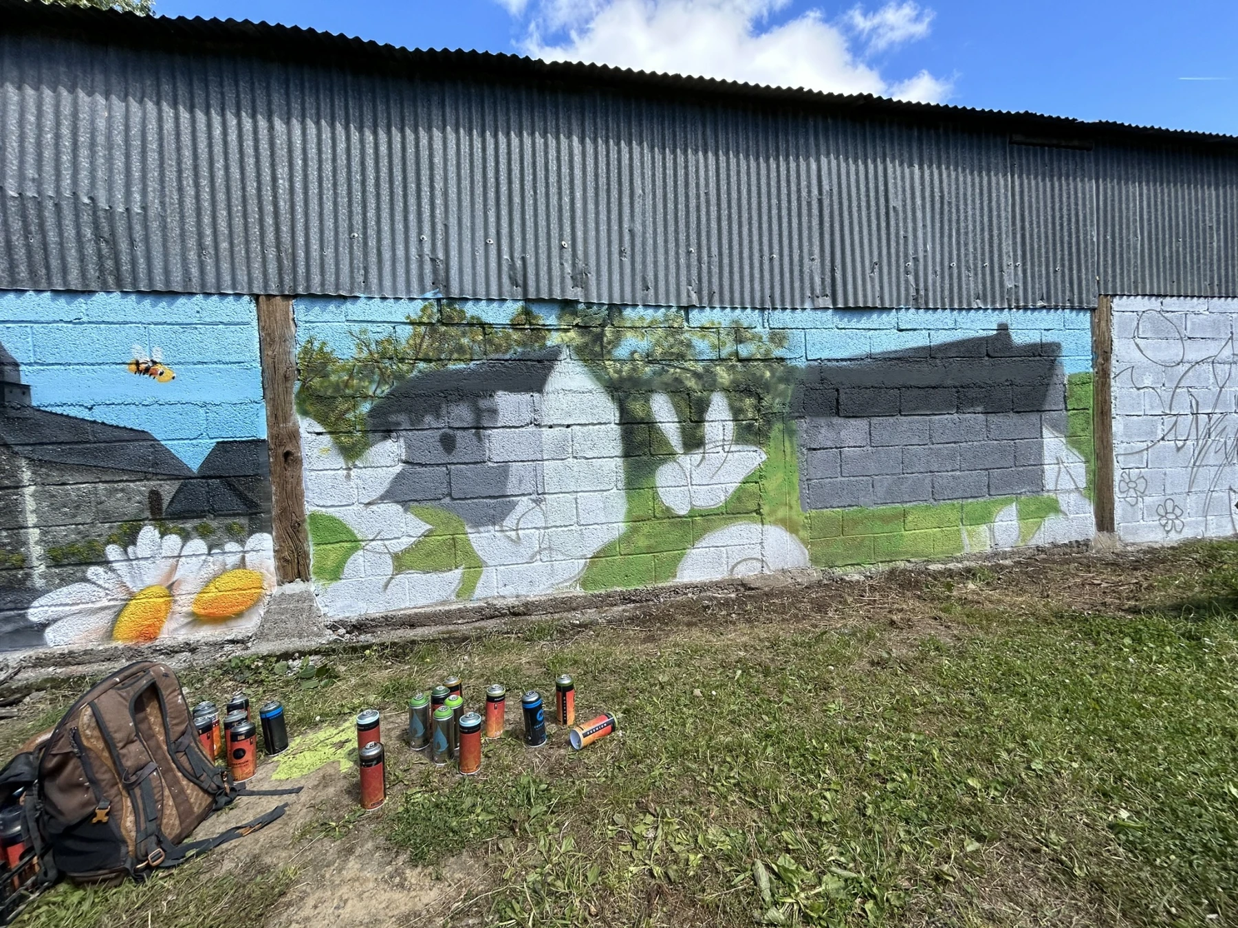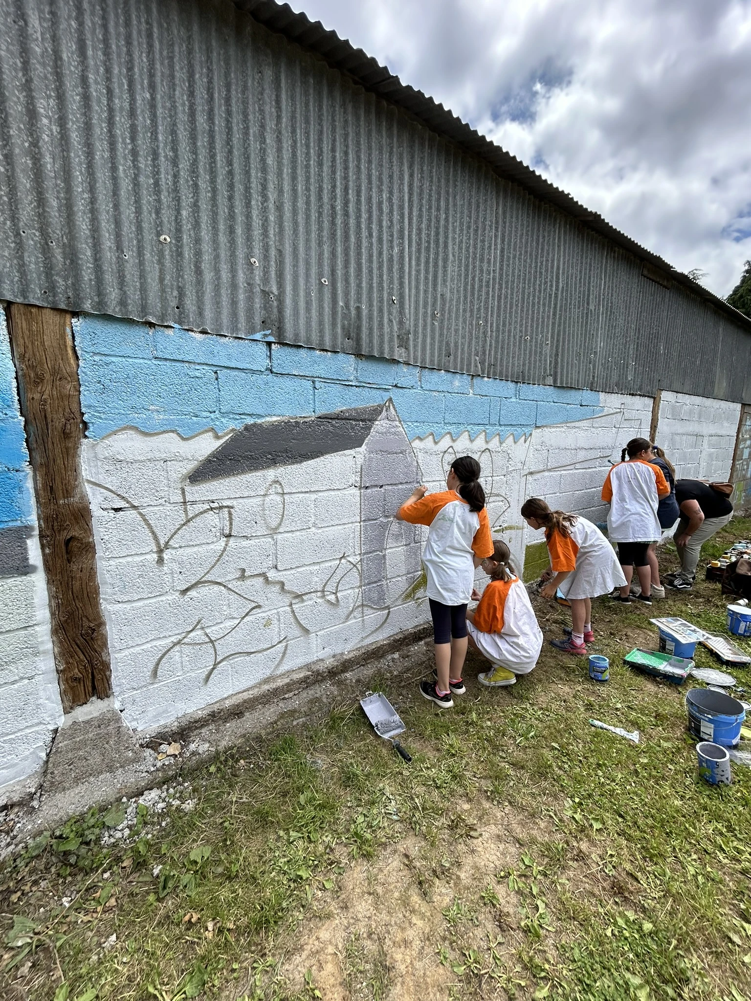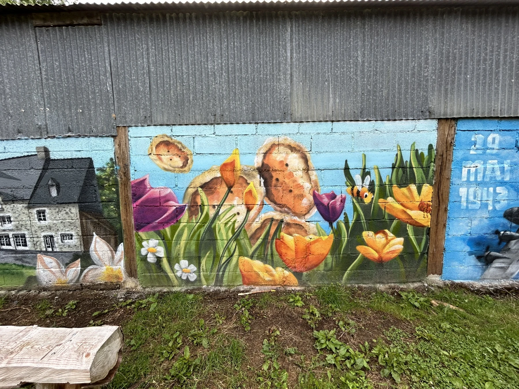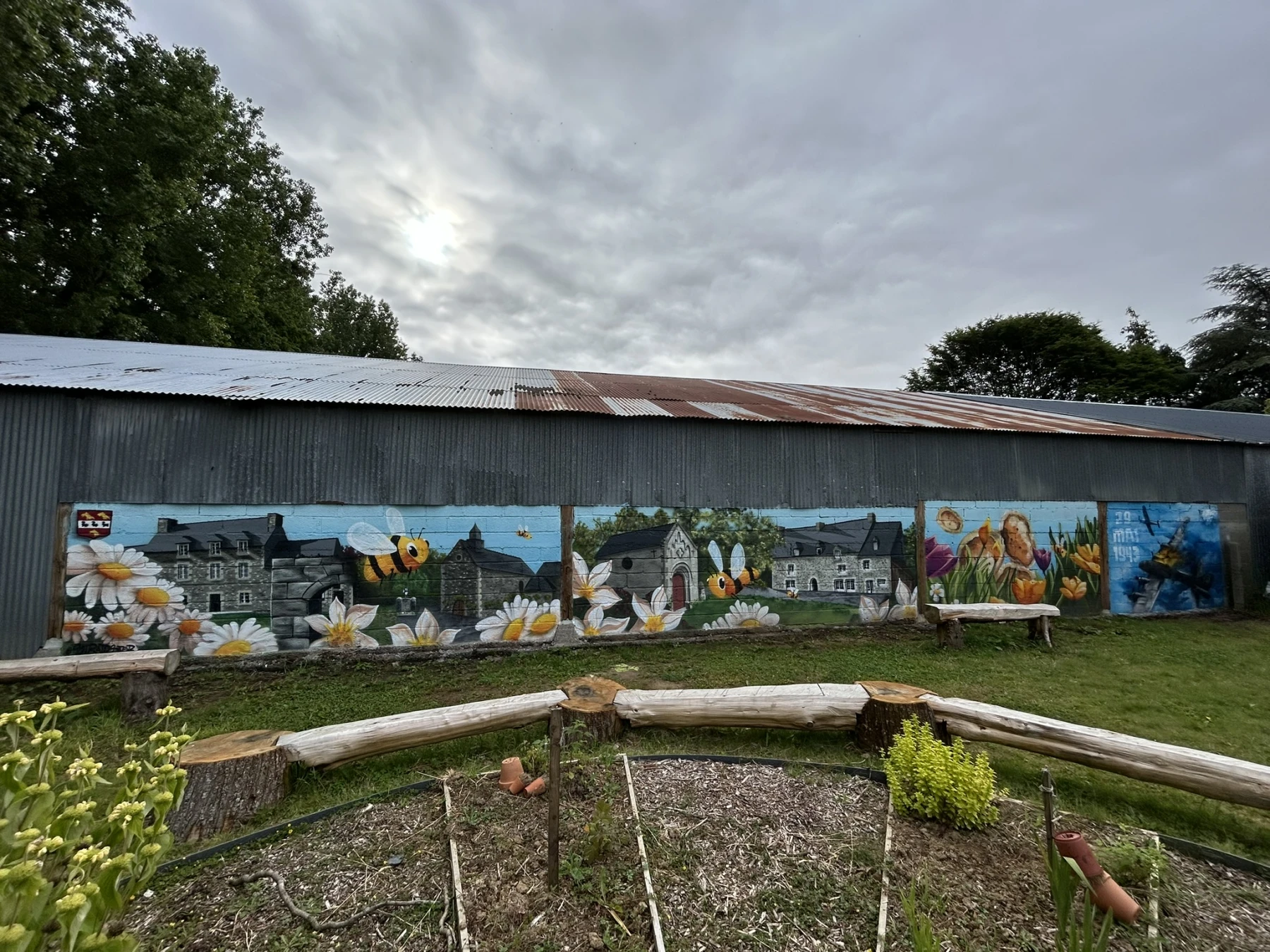Fresque décorative et participative pour les 90 ans de la commune, regroupant le patrimoine et l'histoire de la commune