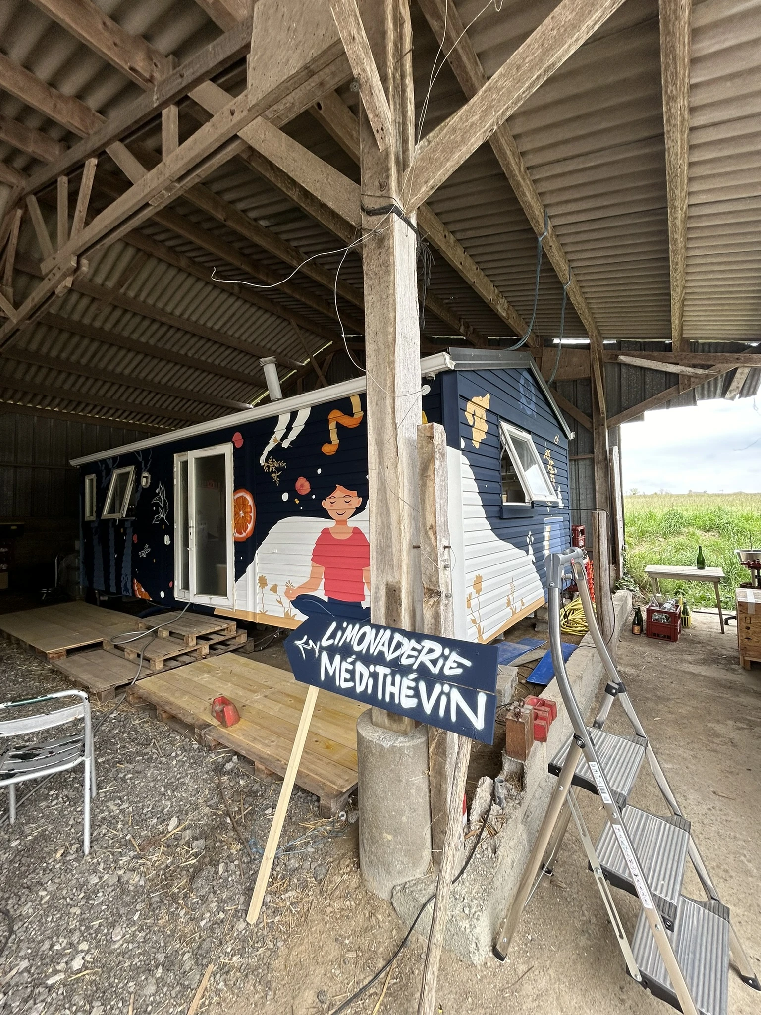 Fresque décorative pour la limonaderie Médithévin illustrant son logo et les produits utilisés pour la confection des limonades artisanales